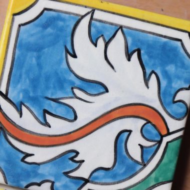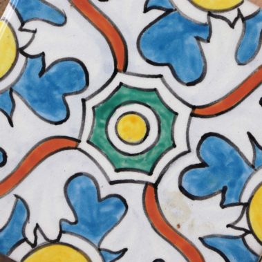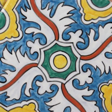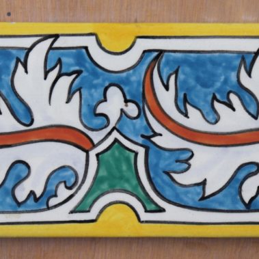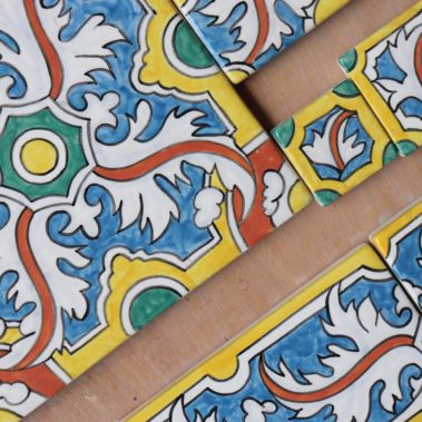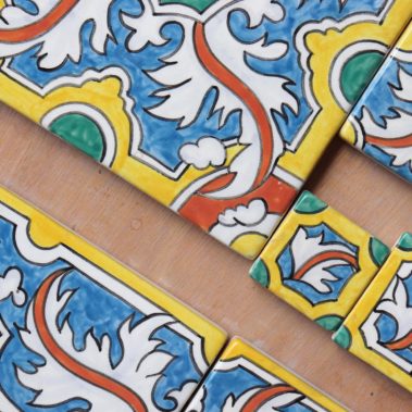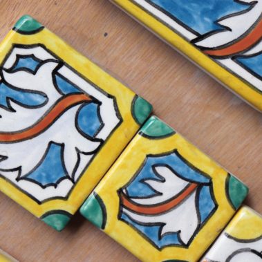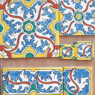 Inspired by century-old ceramics from Braganza, Portugal, this decorative ceramic tile is beautifully hand-painted on white bisque and finished with a glossy glaze. Each design includes borders, corners, large decorative tiles and accent dots. The vibrant colors in this line are perfect for pairing with natural stone, deep greens, and cobalt blue tiles. Perfect for fountains, kitchens bathrooms, risers, and floor accents.