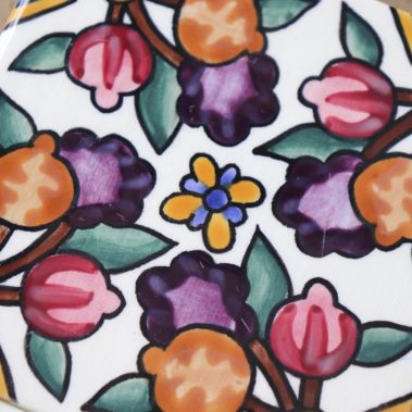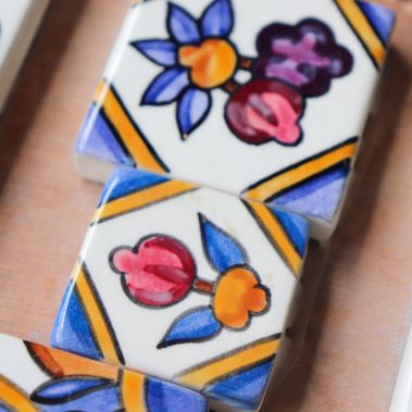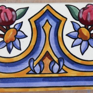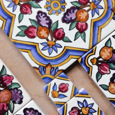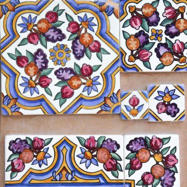 Inspired by century-old ceramics from Porto Alegre, Portugal, this decorative ceramic tile is beautifully hand-painted on white bisque and finished with a glossy glaze. Each design includes borders, corners, large decorative tiles and accent dots. The vibrant colors in this line are perfect for pairing with natural stone, deep greens, and cobalt blue tiles. Perfect for fountains, kitchens bathrooms, risers, and floor accents.